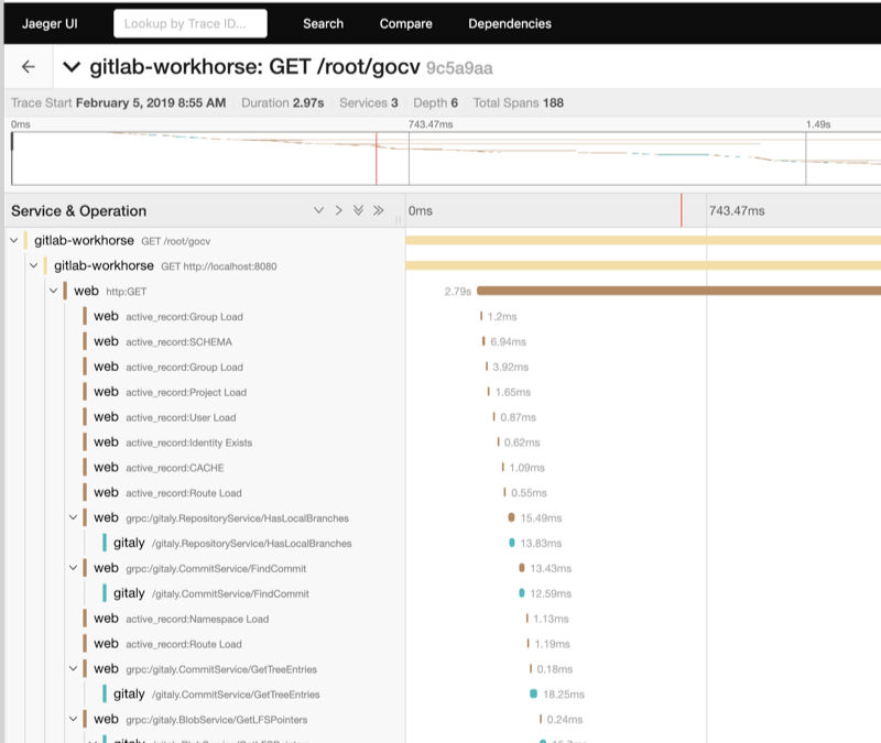After reconfiguration, Jaeger dashboard is available at http://localhost:16686. Another way to access tracing from a GDK environment is through the performance-bar. This can be shown by typing p b in the browser window.
